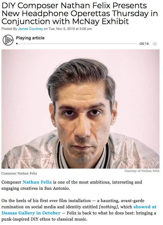I just wrapped my headphone opera in San Antonio and now it’s time to look towards this Austin premiere! I’m really excited about this one. It’ll be in Austin at the Blanton Museum of Art and feature sopranist, Katrina Saporsantos. She’ll be accompanied by harp, strings and a wind quartet. Think immersive and moving. November 21st at 6pm. And I’ll post content from the McNay San Antonio show as soon as i get the chance!