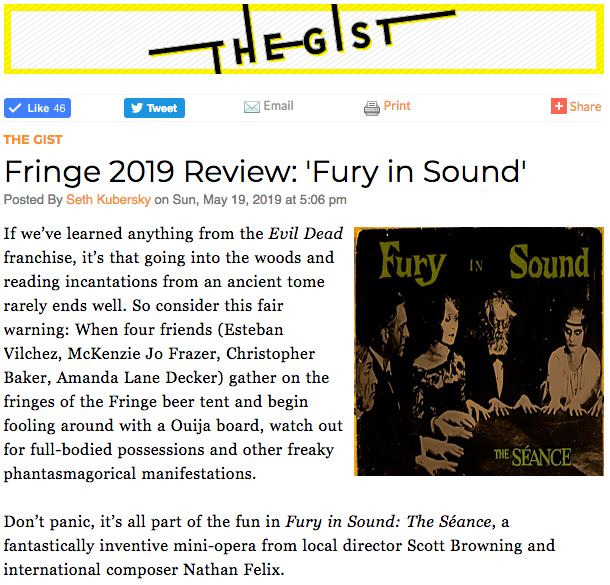“Best of all, Felix’s goosebump-raising score offers an eerie idea of what it might sound like if the composers of Les Miz wrote a musical version of The Exorcist.” You can still see the “silent” musical Wed-Sun this week at Fringe!