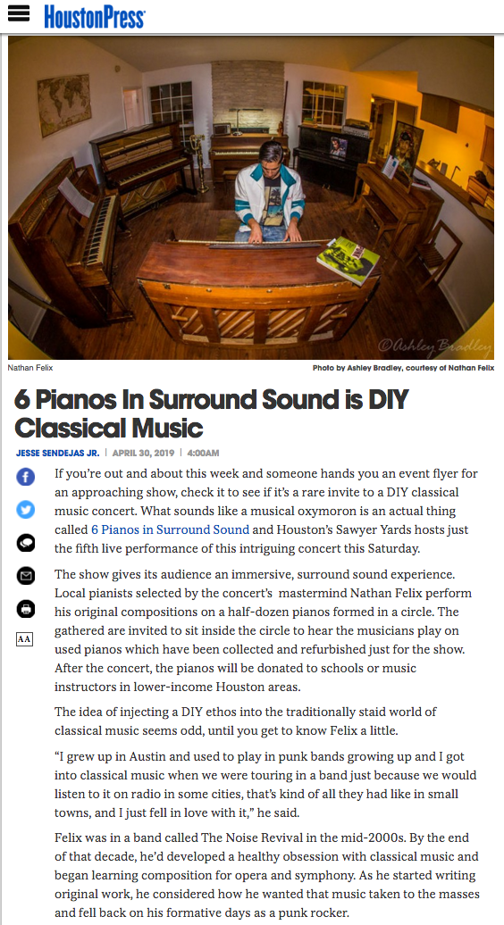 This Saturday May 4th, 6-Pianos in Surround Sound is here at Sawyer Yards (1502 Sawyer St). 7PM. It’s free and open to the public and we’ll have free wine, whiskey and beer. Jesse Sendejas at the Houston Press interviewed me for this wonderful encapsulation of the heart and soul of the project. Click on the photo for the entire story.