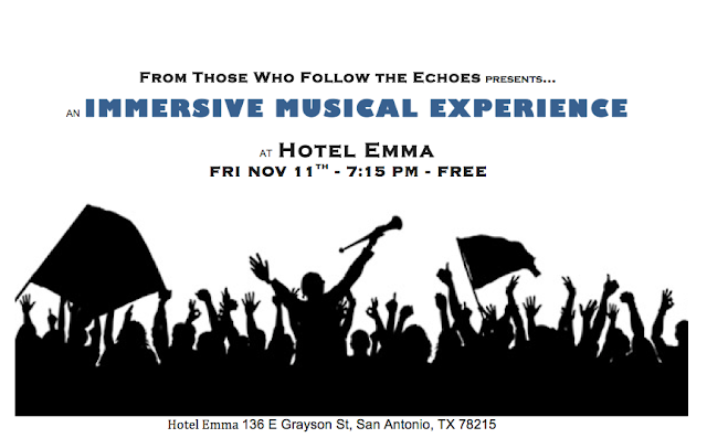 So I basically started my own choir. It’s called From Those Who Follow the Echoes. Talk about a reality show. Cancelations and ghosting galore. But the group that has committed is beautiful and the purpose is to bring people and their stories together. Our first concert is Friday November 11th at Hotel Emma in San Antonio. The choir will be spread out within the Sternewirth room in Hotel Emma with some singers up on the balcony behind the old bar and then the rest being strategically dispersed throughout the space. A small string section will be in the center with the conductor. This performance is immersive with the audience, as attendees will be sitting and standing amongst the performers. THEN…