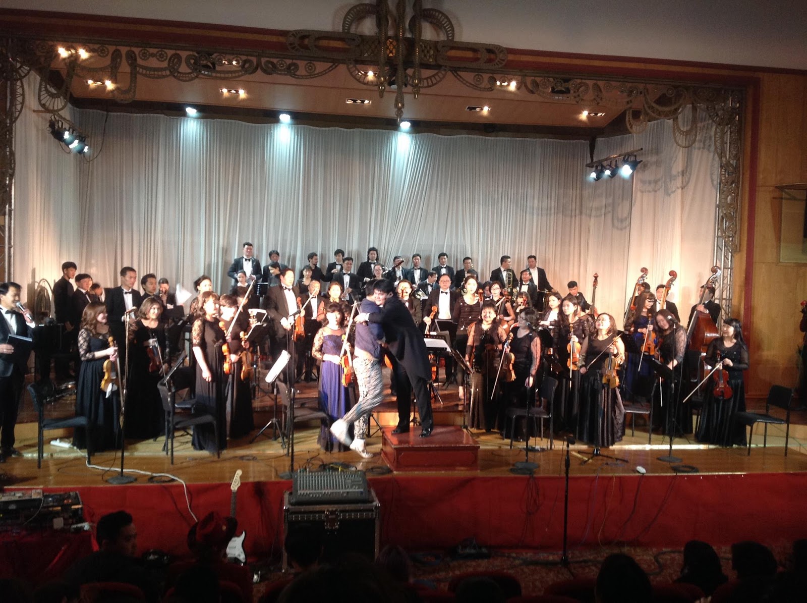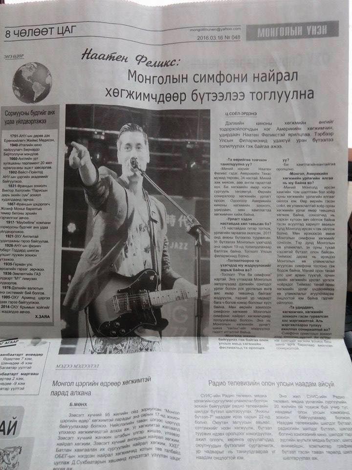 I’m back in the USA and finally have a little more time to reflect on my experience in Mongolia. It was a very unique experience working with the Mongolia Philharmonic and one I’ll hold close to me for various reasons. The press coverage was overwhelming. I did close to 10 different interviews. I’m still tracking down some of the content but I wanted to share an interview on TV (skip to 2:10) and newspaper (see below). And then check out the photos of me working with the orchestra and giving a huge thank-you-hug to the conductor. For additional photos go to my FB or Flickr