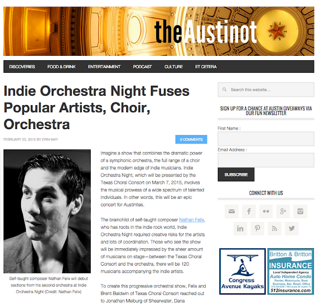 HUGE Feature by The Austinot who interviewed me about Indie Orchestra Night, the show I’m producing featuring Texas Choral Consort plus an orchestra backing up 4 killer artists from Austin – Shearwater, Dana Falconberry, Zeale & The Rocketboys. A movement from my 2nd symphony, NEON HEAVEN, will also premiere. Read the full story HERE or by clicking on the image below.