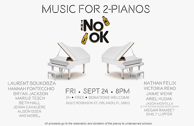 I’m excited to bring my benefit concert for 2 pianos to Orlando this fall. Join me and other talented local artists on Friday September 24th (8-10pm) at Nook for a night of diverse music ranging from classical to jazz to pop to rock to burlesque and more! Donations are welcome and encouraged with all proceeds going towards the restoration and donation of the pianos to schools in underserved areas.